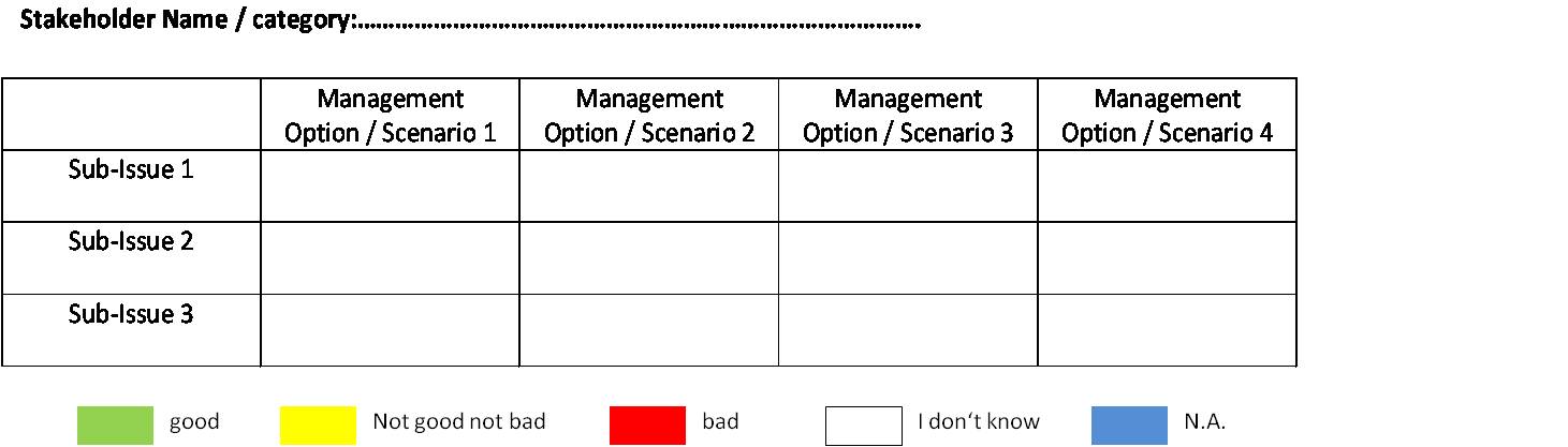 In order to achieve what is described above, it is wise to prepare for each stakeholder a table where all the sub-issues form the rows and regulatory options form the columns, the cells being blank and sufficiently big for the stakeholders to write their opinion within the cells, using text or a colour code e.g. from GREEN for Good/Agree to RED for Bad/Disagree (see illustration below). This table will be accompanied by the text describing the sub-issues and the regulatory options. Stakeholders will need to be able to read this text while working on the tables.